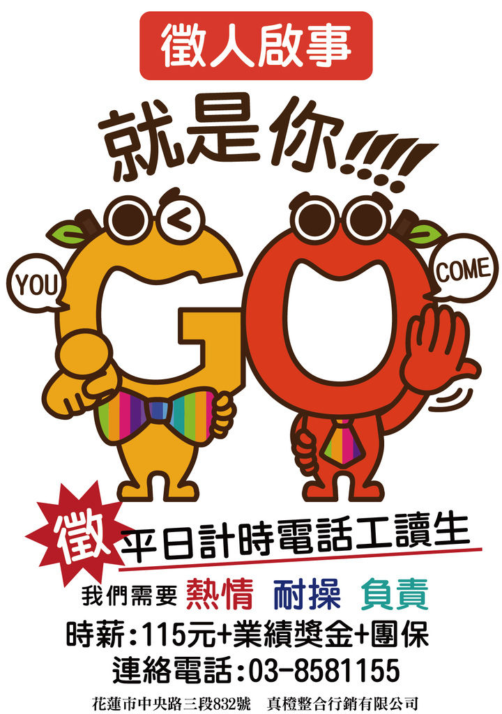【花蓮民宿聯名網-真橙整合行銷有限公司快訊】 徵平日計時電話工讀生